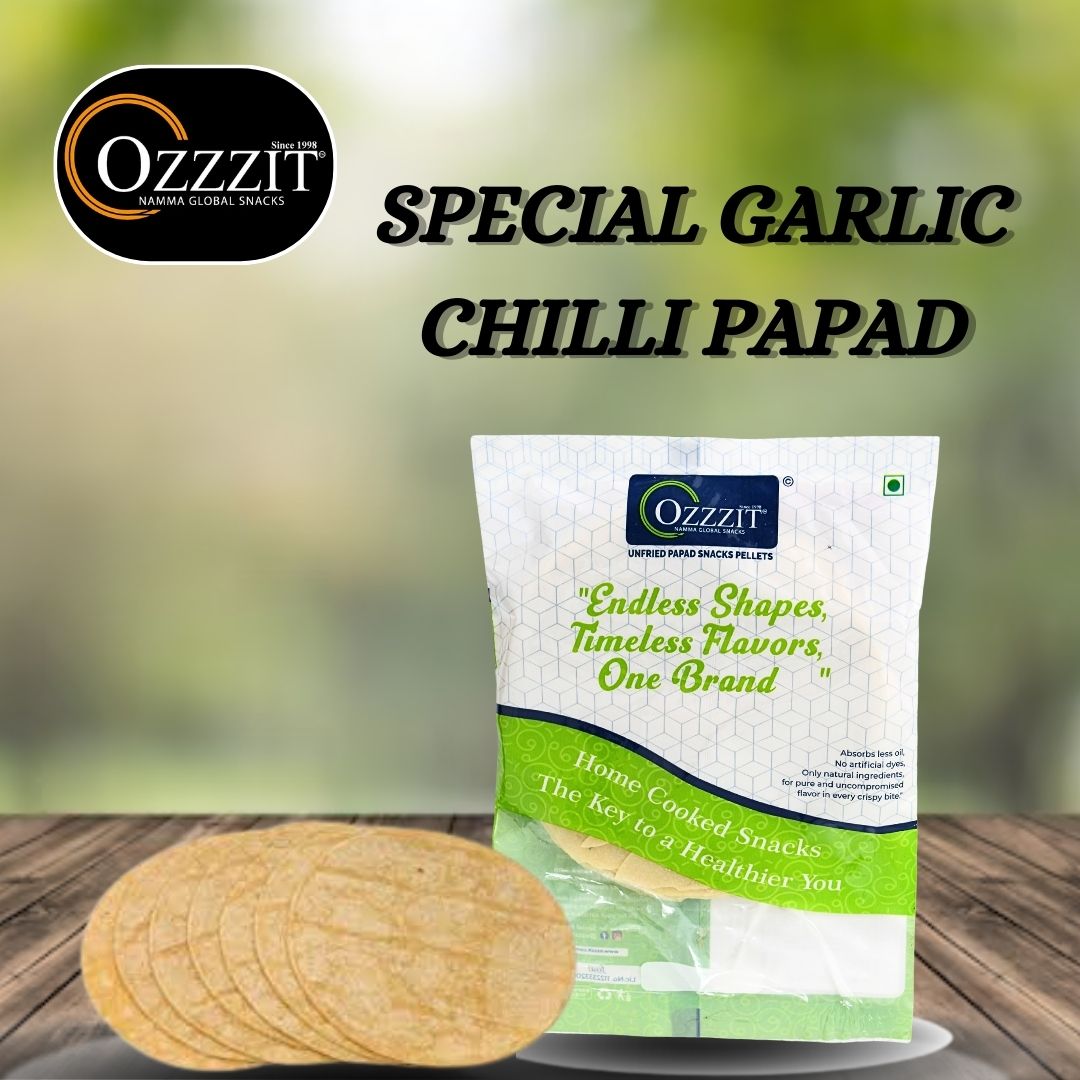 Crispy papadums with a delicious garlic flavor and a spicy kick from the green chilies. Garlic chilli papad could be served as an appetizer or accompaniment to a meal, paired with chutneys or sauces for dipping.